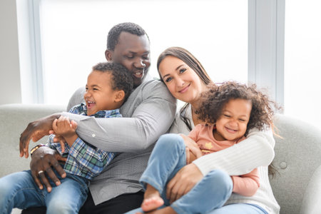 A diverse family of five, consisting of two parents and three children, share a warm and joyful moment in their modern living room with plenty of natural light.