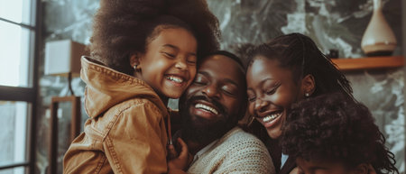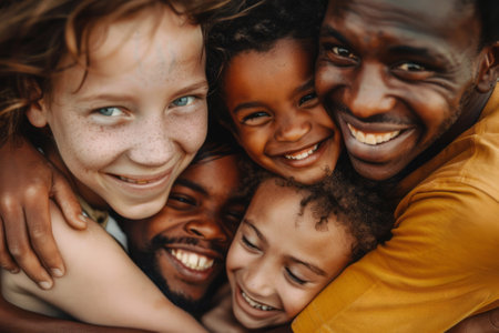 A close-up captures a family sharing a moment of joy. Five individuals are embracing, each displaying a genuine smile. Soft lighting illuminates the scene, highlighting the warm colors and textures. The composition suggests a domestic setting. Suitable for illustrating family dynamics or promoting positive relationships, it is ideal for commercial applications.