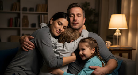 A loving family of four, including parents and two children, share a warm embrace on a sofa in a dimly lit living room. The scene is illuminated by a soft lamp, creating a cozy atmosphere of happiness, safety, and togetherness.