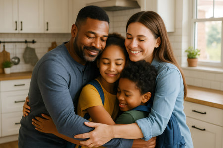 Happy multiethnic family embracing in kitchen before school, enjoying tender moment of affection and togetherness