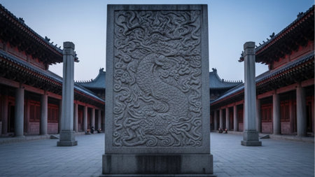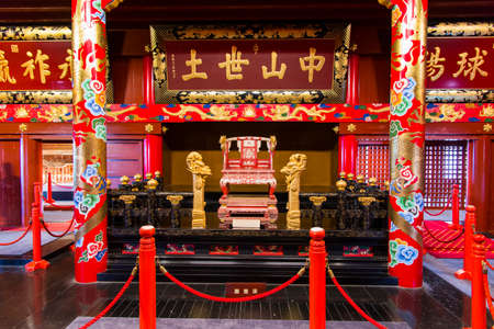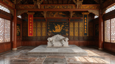 A detailed stone throne, adorned with a prominent dragon motif, sits centrally in a historic Chinese palace hall. Red banners hang beside paneled walls, illuminated by soft light.