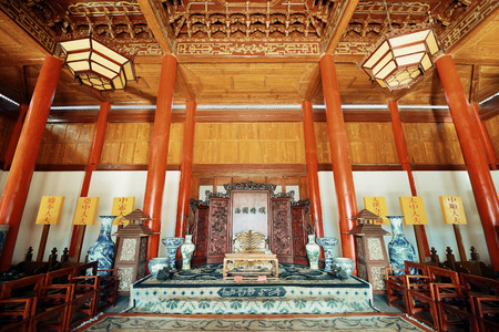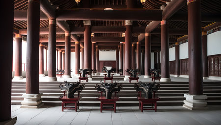 old ancient chinese imperial hall with a lot of wooden pillars