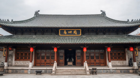 The historic facade of a Chinese temple featuring traditional wooden doors and intricate architectural details. A green, curved roof and red lanterns add to its charm.