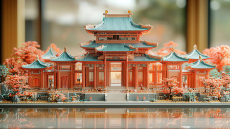 miniature of chinese pavilion with reflection in the water.