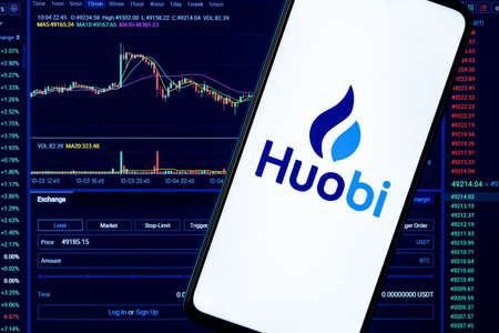 Kazan, Russia - Oct 05, 2021: Huobi is a cryptocurrency exchange. A smartphone with the Huobi logo on the background of the live trading webpage. Huobi dashboard.