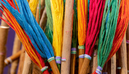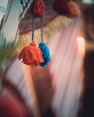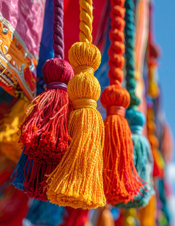 A macro view captures the intricate detail and vibrant colors of handmade yarn tassels on a traditional woven textile.