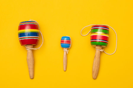 Baleros, traditional Mexican handcraft toys. Cup and ball on yellow background