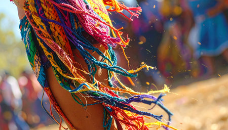 A whirlwind of vibrant, colorful tassels captures the dynamic energy of a dance at an outdoor festival.