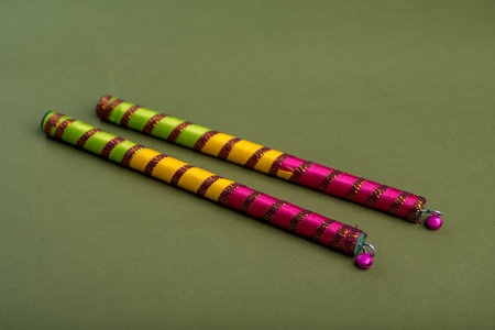 Dandiya sticks on a yellow background. Raas Garba or Dandiya Raas is the traditional folk dance form the state of Gujarat & Rajasthan in India.