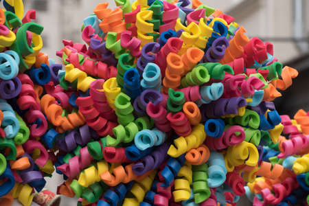 colorful traditional paper craft multicolored umbrellas in thai shop for sale, craftsmanship in Thailand, Chiangmai, rolls of different colors, red, cyan, green and orange