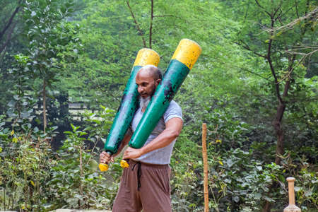 Unidentified Indian wrestlers do exercise by lifting their traditional equipments near ganga Ghat in Varanasi, Uttar Pradesh, India.