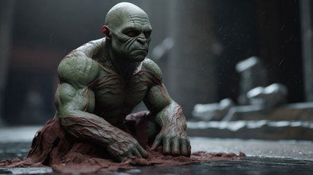 a zombie hulk, covered in decayed flesh, emerges from a shipwreck on a desolate beach. the waves crash behind him as he stands tall, showcasing his monstrous physique. this eerie and captivating image captures the essence of horror and destruction. find this 1x photo on unsplash, available in 600px resolution. ai generated