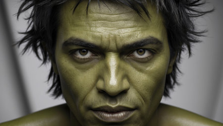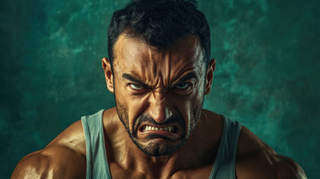 Close-up of a muscular man scowling angrily, displaying intense emotion, set against a dark green background.