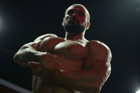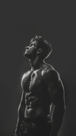 Handsome shirtless bodybuilder shot from below angle, standing on dark background