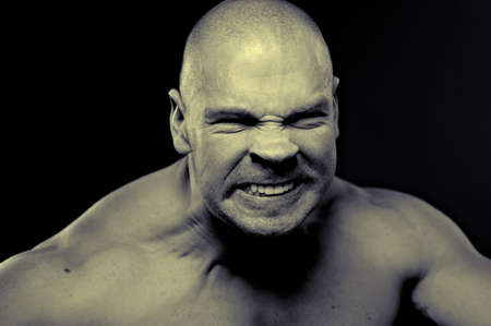Portrait of strong muscular sports man with an intense furious look. Expressive sexy shirtless angry man looking powerful on black background in Workout, training and fitness concept.