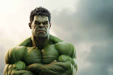 Portrait of a strong muscular man with green muscles posing against cloudy sky