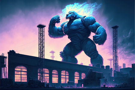 In a sci-fi setting, a monstrous being is created in an old factory by a giant machine emitting a blue light. Fantasy concept, Illustration painting. Generative AI