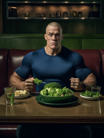 Middleaged athlete holding a bowl of a plate with a prepared salad of cucumber and tomato : Generative AI