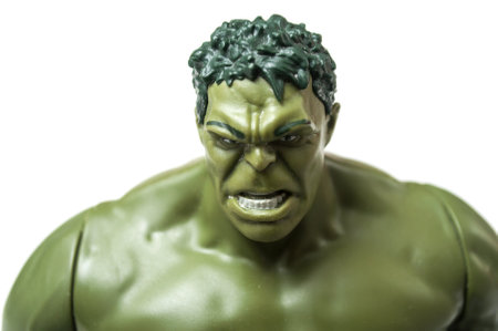 Mulhouse - France - 3 October 2019 - Closeup of Hulk character toy of famous movie and series on white background