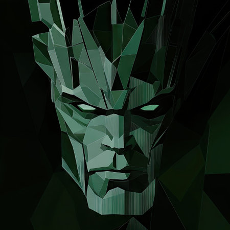 Detailed close-up illustration of a face composed of polygons. The face is a deep, dark green, with light-green accents on the eyes and a serious expression. The face is highlighted by a dramatic use of dark shading and lighting, creating a strong visual impact. The overall style is modern and futuristic, giving the face a sense of mystery and power.