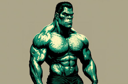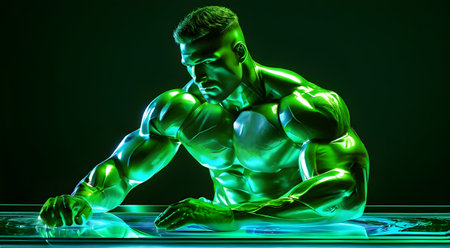 Athlete and strong man with gorilla features in green color. Generative AI illustration