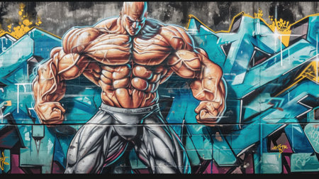 A bodybuilder flexing in front of a graffiti-covered gym wall, blending strength with urban grit.