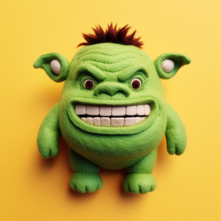 a troll toy mockup in green with a happy expression is showcased on a vibrant yellow background. created in the style of zbrush, this fantastic and grotesque character design features spiky mounds. captured using a lensbaby velvet 56mm f16 lens and sony alpha a7 iii, this unreal engine 5 creation is truly distinctive. ai generated