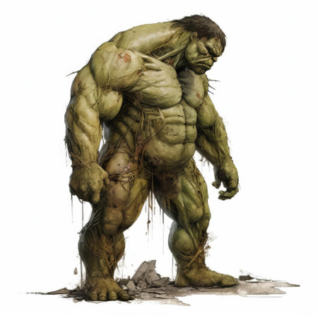 the hulk, a minimal rotting version of the iconic marvel superhero, stands proudly in a full-body pose on a pristine white isolated background, showcasing its eerie, post-apocalyptic appearance, perfect for fans of comic book art, superhero decor, and dark fantasy enthusiasts. ai generated