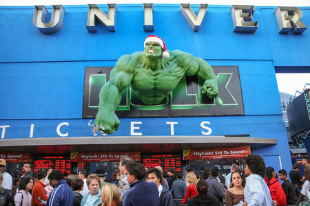LOS ANGELES, CALIFORNIA, US, DECEMBER 25 2006 - Some people line up at the cinema box office inside Universal Studios of Hollywood just below a figure of a popular superhero dressed in a Christmas hat.