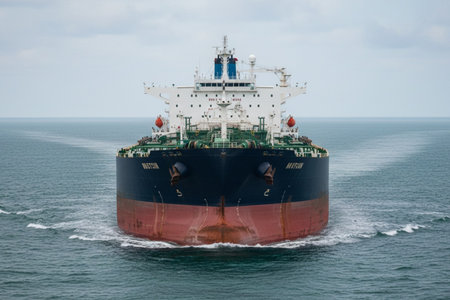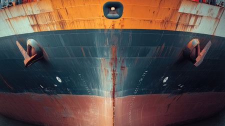 A close-up of a large tanker ship hull, with the company logo and load lines visible, emphasizing the industrial strength and scale of maritime logistics