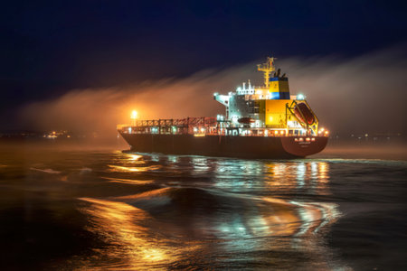 A tranquil harbor scene featuring a cargo ship docked amidst fog, illuminated by soft streetlights, creating an atmospheric and mysterious evening landscape.