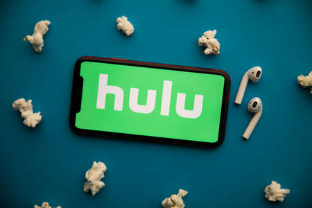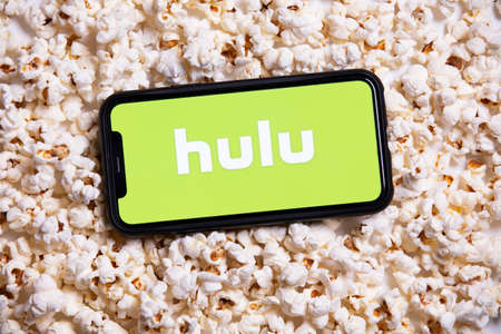 LONDON, UK - MAY 14 2020: Hulu logo on a smartphone with popcorn