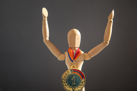 Wooden people figure standing on the podium. The concept of victory and business competition