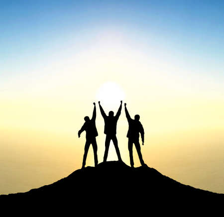 Business competition and leadership concept as a team of business people standing on top of a mountain holding a trophy cup as a symbol of success and teamwork.