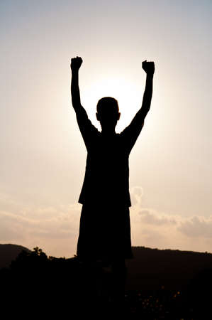 Silhouette woman on sunset background. Woman raising his hands in worship. Christian Religion concept background.