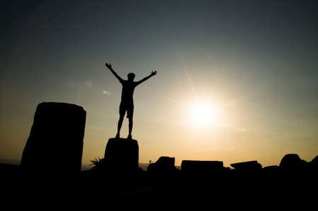 Silhouette of a man who successfully climbed up a high cliff act happy