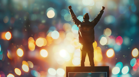A person stands with arms raised in triumph against a glowing sunset embracing the moment of victory.