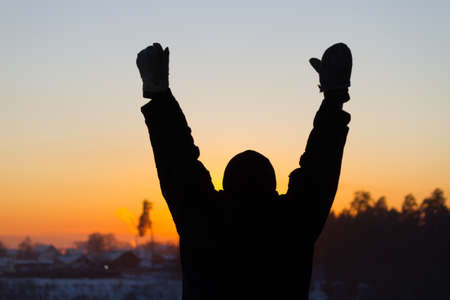 Silhouette of man with raised hands standing on top of the mountain and looking at the sunset
