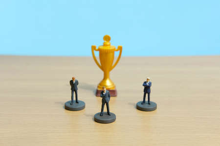 Miniature business concept - businessman lineup rank with golden trophy in the middle