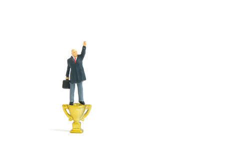 Miniature people toy figure photography. A businessman standing above gold trophy determine to win or become a winner while raise his hand. Isolated on white background. Image photo