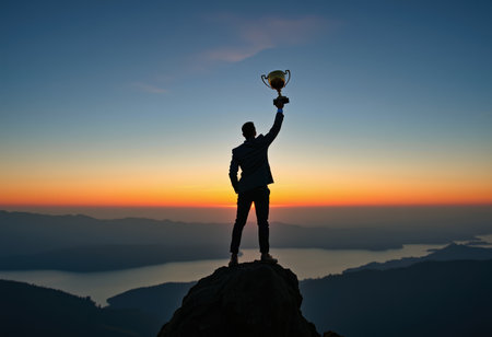 Silhouette man victory raising hands and holding gold medal with sunset sky. Motivation and success concept.