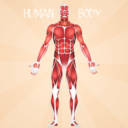 Human muscular system depicting detailed anatomy with visible muscles, tendons, and veins, representing biological science and medical education concepts