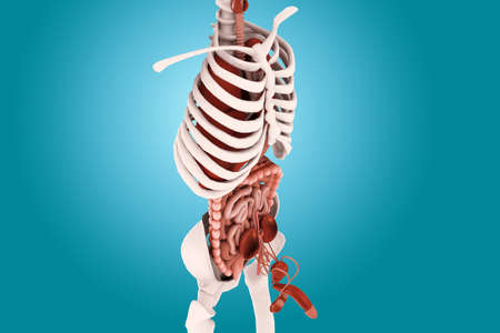 3d human model with inner organs inside, ribs, intestine in doctors hand. Medical banner with copy space for text.