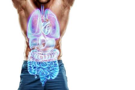 A holographic projection of a scan of human internal organs inside the body of a bodybuilder. The concept of modern medicine, digital x-ray, new technologies, human anatomy
