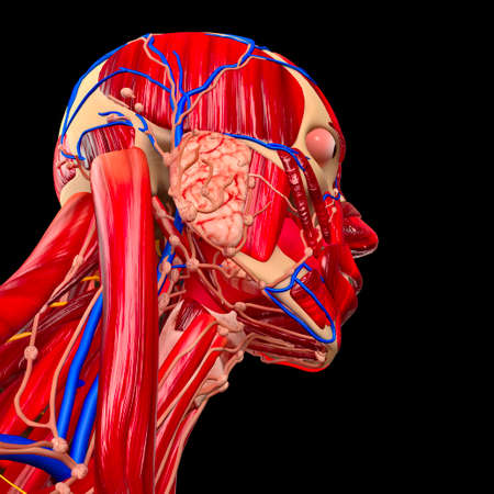 Educational, three-dimensional model of the human muscular system. The muscles of the human head. Science and medical education. The internal structure of the human body.