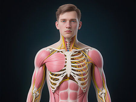 The structure of human muscles on the torso close-up, the biology of the muscular system. Human anotomy concept. 3D illustration, 3D render
