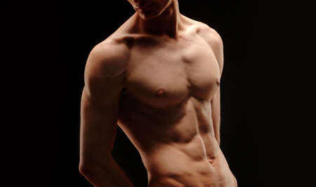 Two shirtless hunks at black background. Close up of an athletic guy with perfect abs. Hunky shirtless male model outdoors.
