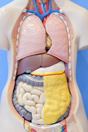 Human anatomy mannequin showing internal organs on light blue background. Space for text
