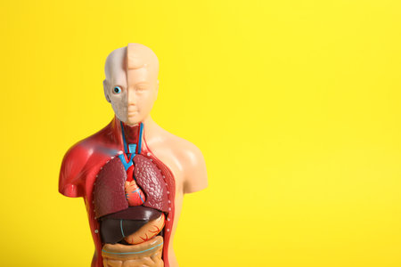 Human anatomy mannequin showing internal organs on yellow background. Space for text