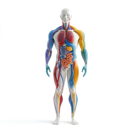 A 3D anatomical model showcasing the major systems of the human body, including muscles, organs, and vessels, colored for identification.